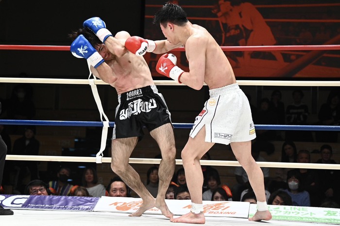 左ミドル、左フックの関口は接近戦になると左ボディ、アッパーも打つ。森本も負けじとショートで対抗。すると森本は左ロー、左ミドル。