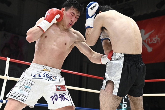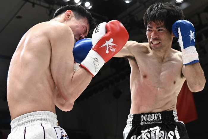 左ボディ、右ボディ、また左ボディ、そして左三日月とボディを攻める関口に、森本は胴廻し回転蹴りも空振り。互いにガードを固めて腕を合わせると、ショートで打ち合った。