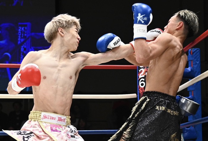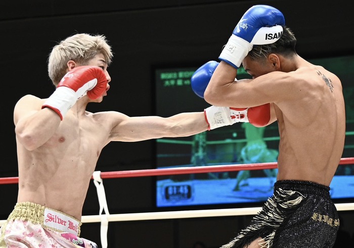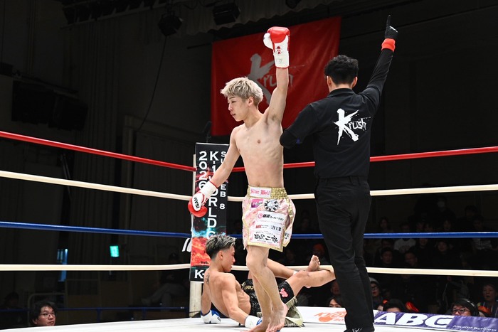 1R、大平が右カーフを蹴ると、松本はすぐに前進してのワンツー、大平も右ストレートを返す。大平がワンツーの連打からm着いハイをヒットさせ、大平をコーナーへ追い込んで左右の連打。右フックでダウンを奪う。