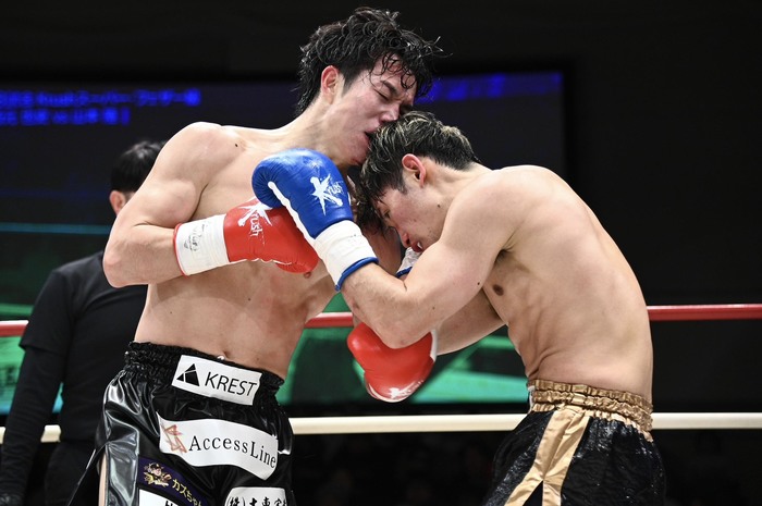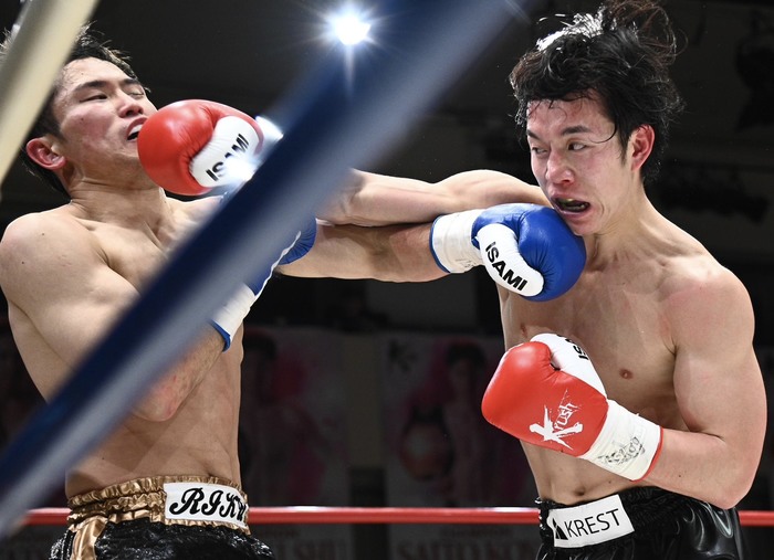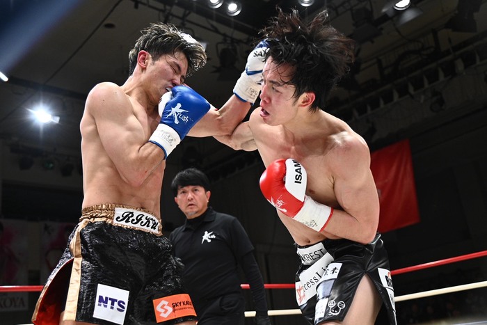 3R、前に出る西元をジャブで迎え撃つ山本。西元が右フックを打つと山本も右フックを打ち危険な交差。山本の左右フックがヒットする中、左右ボディも打つ。西元は空振りが多いが右ストレートをヒット。山本がジャブ、右フック。西元も左フック、右ストレートを返す。両者リング中央で足を止めてフックの打ち合いになると、山本が回転力で上回るが西元も喰らいつくようにパンチを出す。