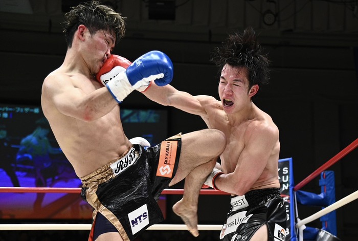 1R、山本が右フックから右の三日月、西元は圧を強めて前へ出ていき、山本の左ボディに左フックのカウンターをヒットさせる。右カーフの蹴り合い。左の三日月を蹴る西元は左フック、右フックで飛び込むが山本にかわされる。