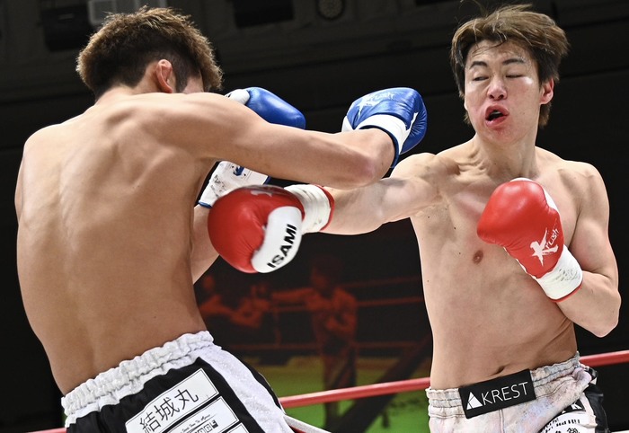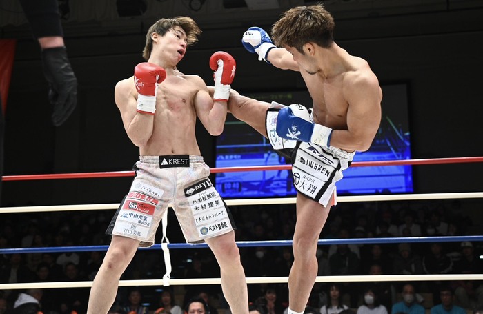 ワンツーの連打で前に出る岡嶋に直也もパンチで応戦するが、右ストレートが何度も直撃。さらに右カーフも蹴る。直也は左三日月を連打して反撃するが、再び岡嶋の右ストレート連打をもらって後退。