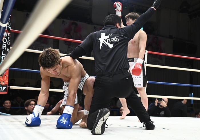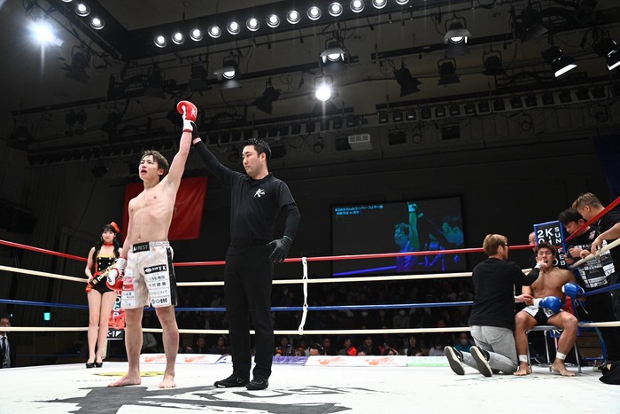 2R、右カーフの蹴り合い。直也は頭を下げて左フックで入り込むが、岡嶋も打ち合いに応じる。直也がバックハンドブローを空振りして転倒するとダウンコール。前へ出る直也だが、岡嶋が右ストレートからの狙いすました左フック。今度は完全なダウンでKO勝ちとなった。