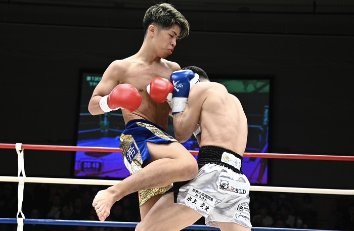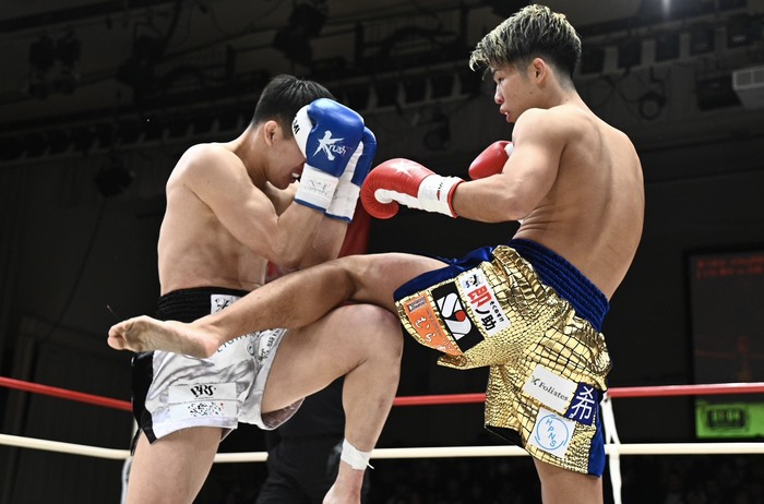 1R、右ローと左ミドルの矢吹に下村はパンチで前へ出る。ジャブから近距離でボディを叩く下村。ガードを固めて丸まる矢吹に左ボディを狙い撃ちする下村に、矢吹はヒザで対抗する。下村はジャブもよく当てる。