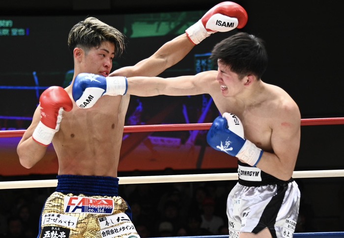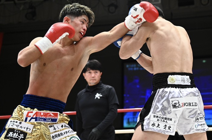 2R、下村の左ボディに左フックを返す矢吹。下村のジャブに負けじと矢吹もジャブを突き、左フック、右ストレートにつなげる。下村は右ヒザから右フック。互いにジャブを被弾するが、下村は右フック2連打。矢吹もワンツーで応戦する。