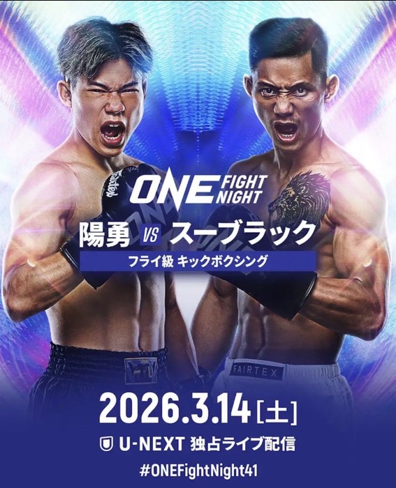 2026年3月14日(土)タイ・ルンピニースタジアム『ONE Fight Night 41』(U-NEXT配信)に、陽勇(=ひゅう/Team Mehdi Zatout/TEAM3K)の出場が決定。フライ級キックボクシング3分3Rでスーブラック・トー・プラン49(タイ)と対戦することが発表された。