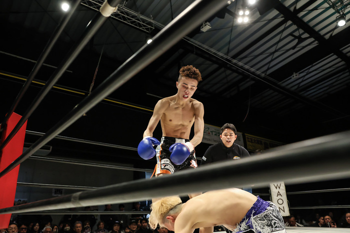 オープンスコアは三者とも18-18と全くのイーブン。「3Rをとった方が勝ち」というわかりやすい展開の中、鉢田はワンツーからの右ボディストレートで動きが鈍くなったゆいらからスタンディングダウンを奪う。こうなると、もうゆいらにやり合う気力は残っていなかった。鉢田が連打を浴びせると、キャンバスに倒れ込んだ。