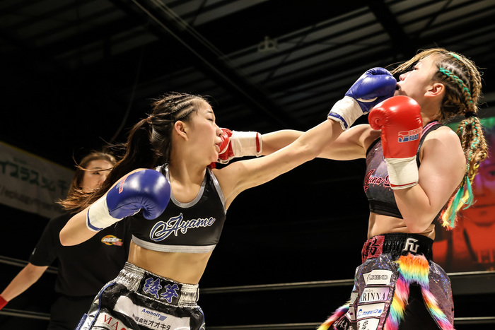 1Rから上田樹那(山口道場)はワンツーやローを繰り出しながら積極的に前に出る。一方、昨年12月、RISEの両国国技館大会でデビューした綾芽(楠誠会館)はムエタイ流のカチッとした構えからいきなり右ハイを出すなど、手数こそ少ないものの、適正打を放っていく。2Rまでのオープンスコアは1-0で綾芽。