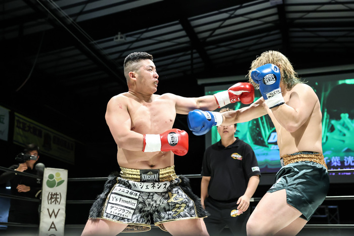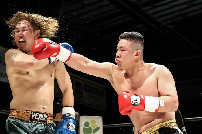 ともにデビュー戦というフレッシュなヘビー級の一騎討ちが実現した。七夕(木内會)vs千葉洸大(方上道場)。アマチュアボクシングの経験もあるという七夕は重量級にありがちなブンブン丸系ではなく、1Rから正確な右ストレートを繰り出していく。一方、空手がベースの千葉はローを返していく展開に。途中から千葉は鼻血を出すなど、時間が経つにつれ七夕のペースになっていく。