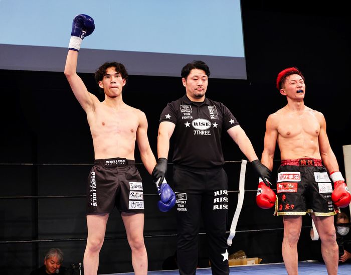最終R、もう後が無い北濱はパンチを振るい回転胴廻し蹴りもヒットさせるが、小泉も攻撃を返す。判定は1・2Rのアグレッシブ度の差で小泉がプロファイターとしてのBOUT初陣を勝利で飾った。