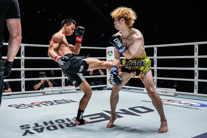 ジャブを突いて左インローを蹴る嵐舞は左右へ回り込んでジャブ、左三日月。チャラムカオも右ミドルを蹴る。ワンツーの連打で前へ出ていく嵐舞にチャラムカオは下がる。