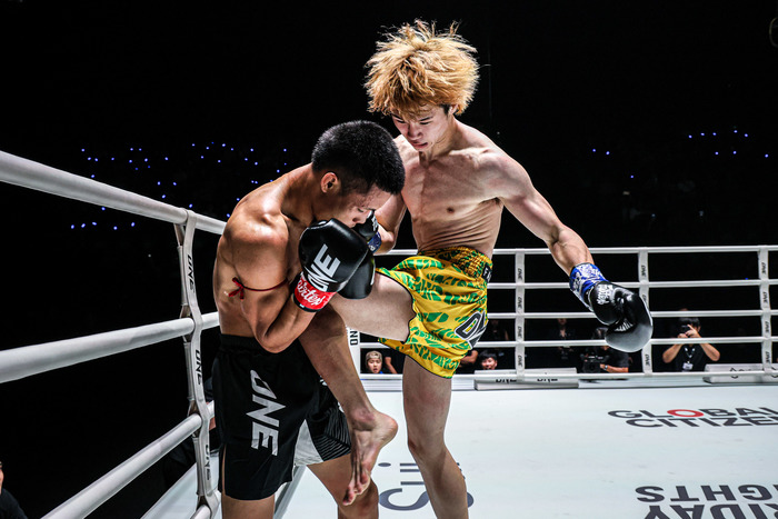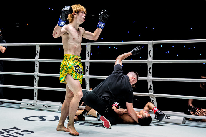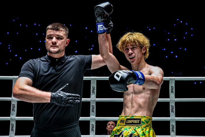 ローブローに苦しみながらもKO勝ちした嵐舞は、勝利者インタビューに「お腹を狙う作戦だったんですけれど、長い攻撃では行けなかったので近付いてヒザで倒そうということで」と答える。。