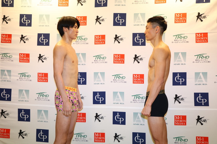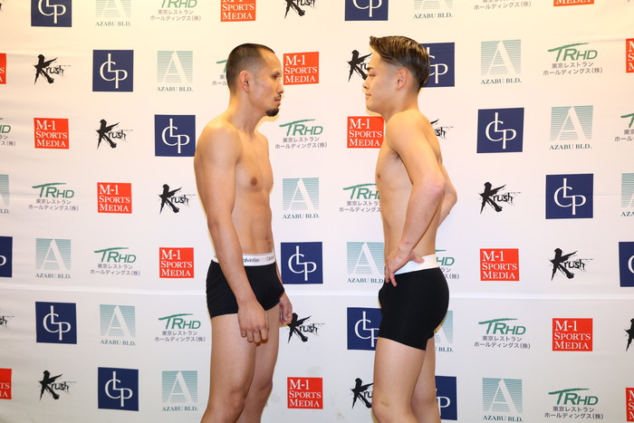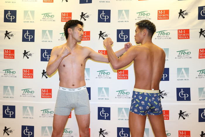 メインイベント(第10試合)のKrushフェザー級3分3R延長1Rで対戦する、新美貴士(名古屋JKファクトリー)はリミットちょうどの57.5kg、松本海翔(TAD)は57.4kgでパス。