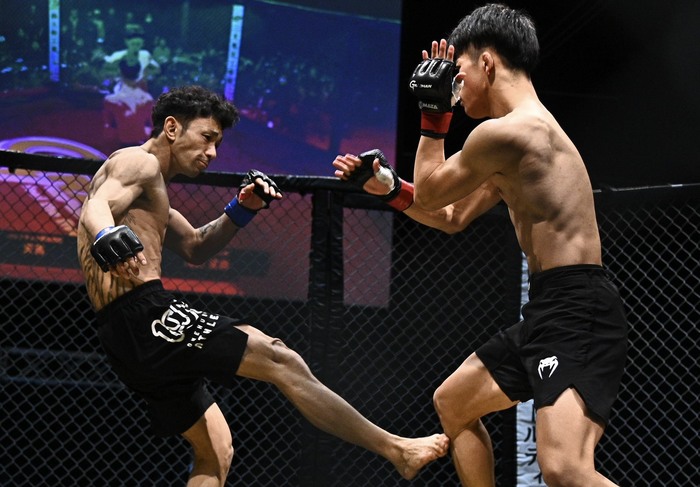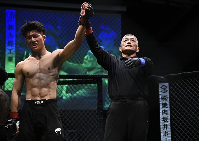 2R、左ミドルハイを打ち込む天馬。さらに左オーバーハンド。岡田は左に右を合わせに行く。詰めた天馬にシングルレッグでテイクダウンの岡田に、立ち上がりバッククリンチの天馬。背中に乗って両足フックで引き込み。正対した岡田が上になると天馬は左で差して立ち上がり。ダブルレッグテイクダウン。