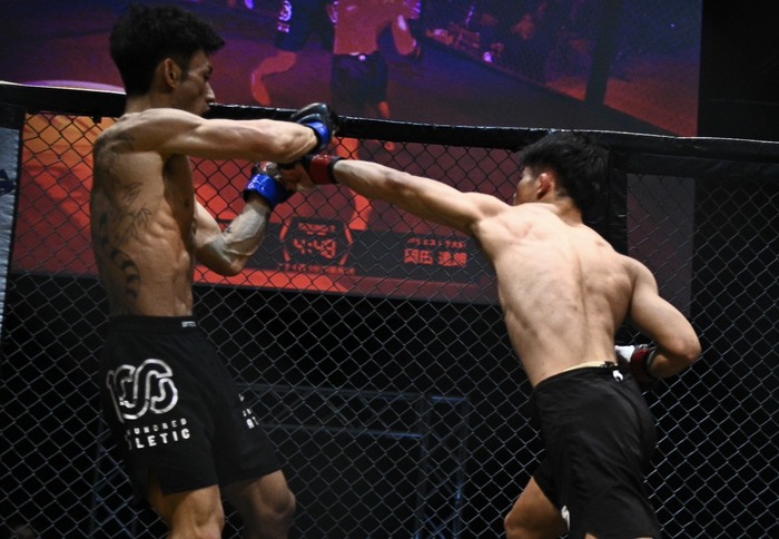 1R、サウスポー構えの天馬。オーソの岡田は右ローからシングルレッグで詰めてテイクダウン、バツク狙いもスクランブルする天馬は左差し。そのバックを奪う岡田がバックマウントからボディトライアングル。スクランブルする天馬。