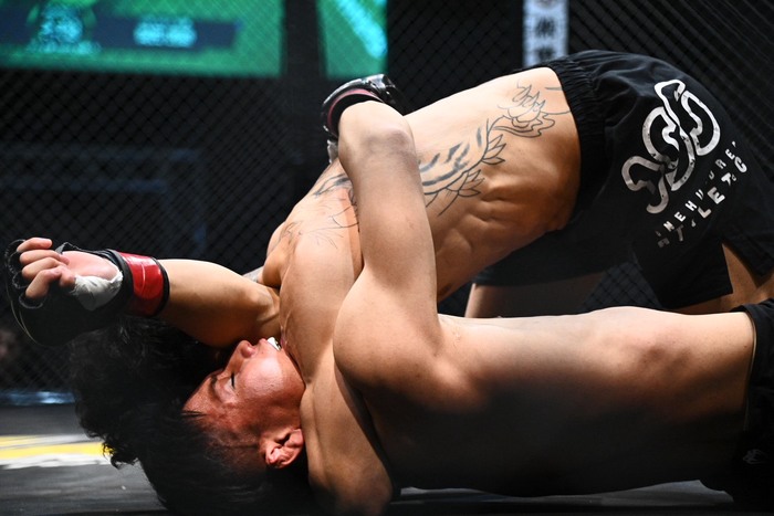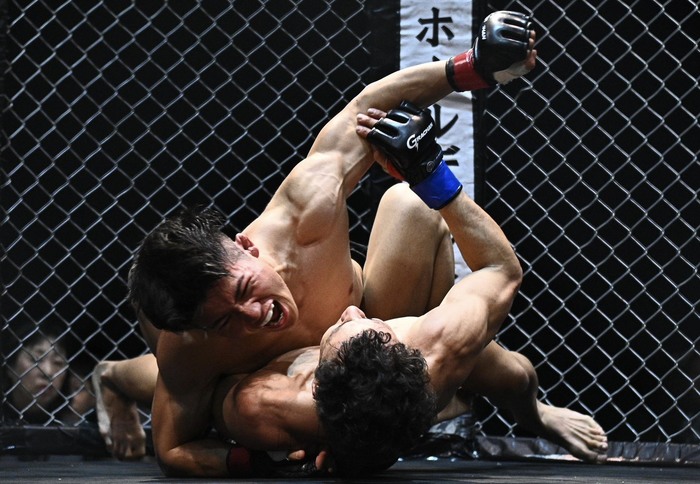 右インローを当てる岡田。天馬の組みにトップになるが。差し上げた天馬がバック、ボディトライアングル。背後からパウンド。残り時間を見て腕十字もホーン。