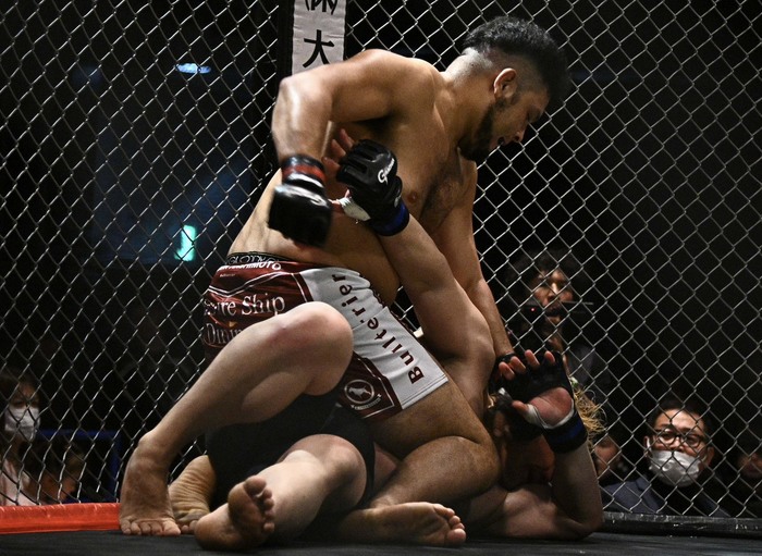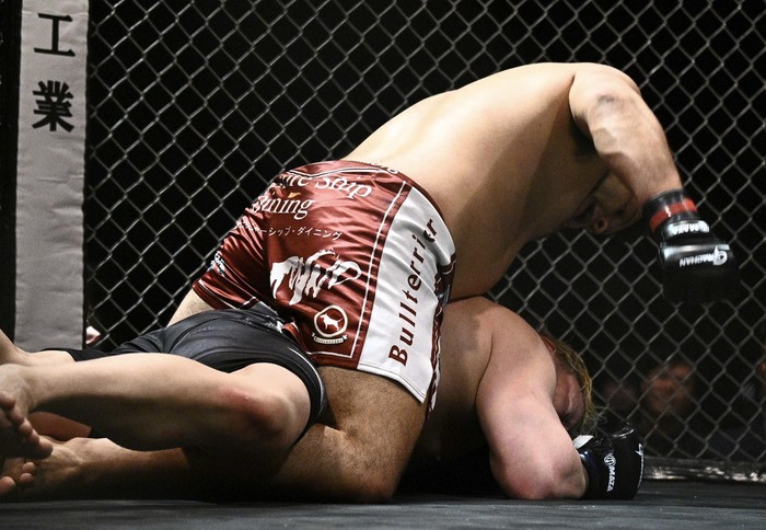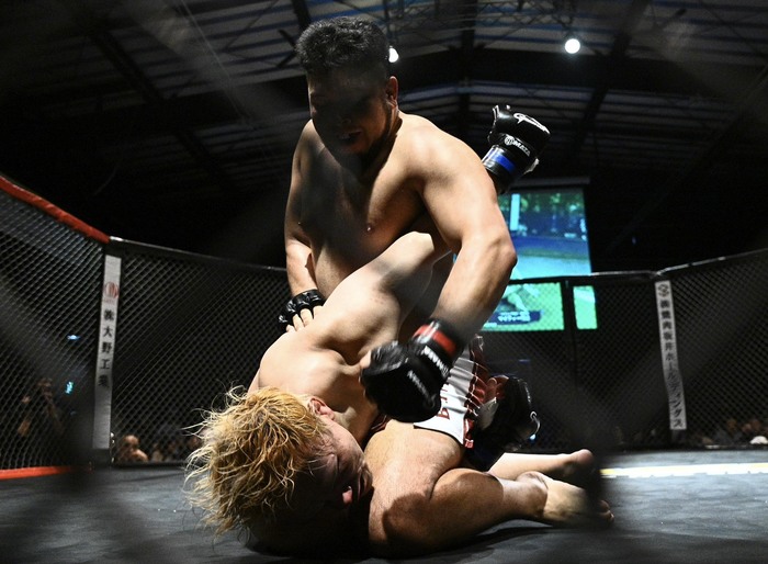 さらにシングルレッグも、切ったハシモトが左右連打。村上はシ左で差して組むもハシモトは内股でテイクダウン! 亀から立とうとする村上の腰を抱いてサイドバックからパウンド。さらに仰向け、うつ伏せになった村上にマウントでパウンド。レフェリーが間に入った。