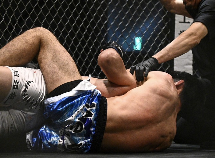 2R、左を突いて近づく八木に、高橋は左ミドル、さらにケージに詰めてダブルレッグを肩口に持ち上げ、中央側にテイクダウン。両足をフックしてバックに。背後からパウンド、リアネイキドチョーク狙い。亀にまでヒザを立てた八木に両手でパウンド。そのまま背負って立つ八木の背中に乗ったままリアネイキドチョーク狙い。立ったままの八木の右腕を喉下に差し込み、後方に引きずり込んで絞めて極めた。