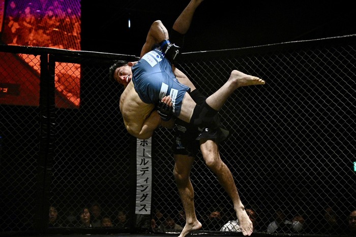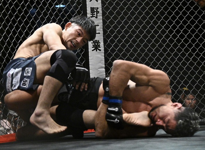 右を振って詰める山下。右小手で組むチアゴはケージ背に。押し込む山下だがブレーク。山下の左フックにカウンターのダブルレッグテイクダウンのチアゴがすぐにパスガード、マウント。肩固めを狙う。