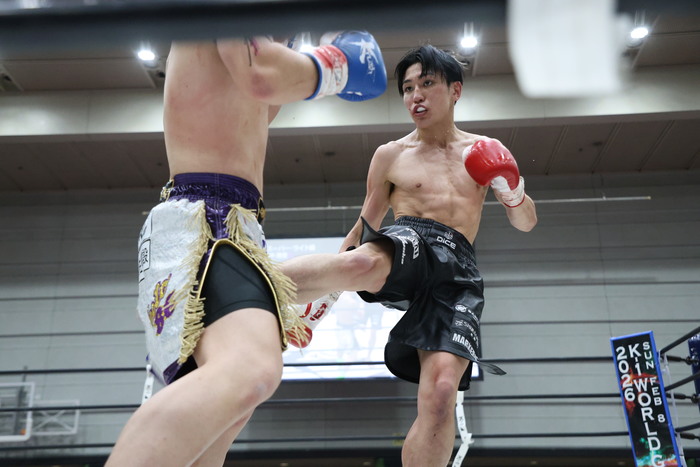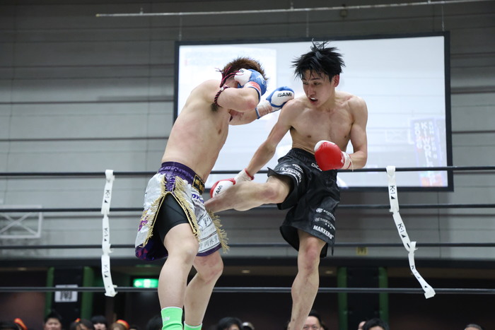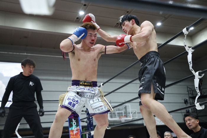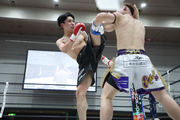 1R、サウスポーの大利は田中の左右フックに左ヒザを連打。田中は右ローを蹴っての左右フック、大利は右カーフを蹴る。