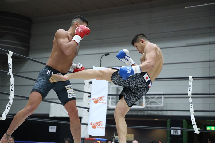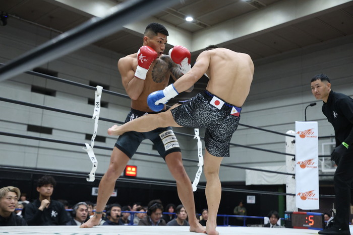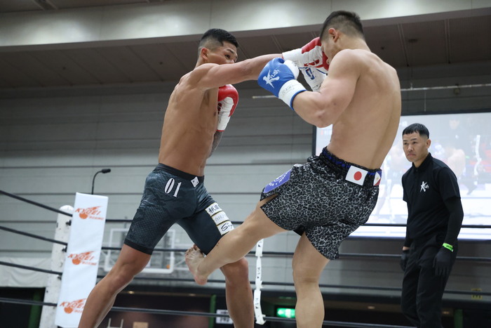1R、サウスポーの松本は開始と同時に突進して左ローを連打。杉若も右インカーフを蹴っていく。この右インカーフに左ストレートを合わせる松本。杉若は蹴りを出す松本にワンツーを合わせる。左フックを当てて前へ出て杉若を松本がワンツーで迎え撃ち、連打をヒットさせてフラつかせた。松本は右インローと右の与座キック。さらに前へ出てくる杉若に右フックからの左フックを当てていった。