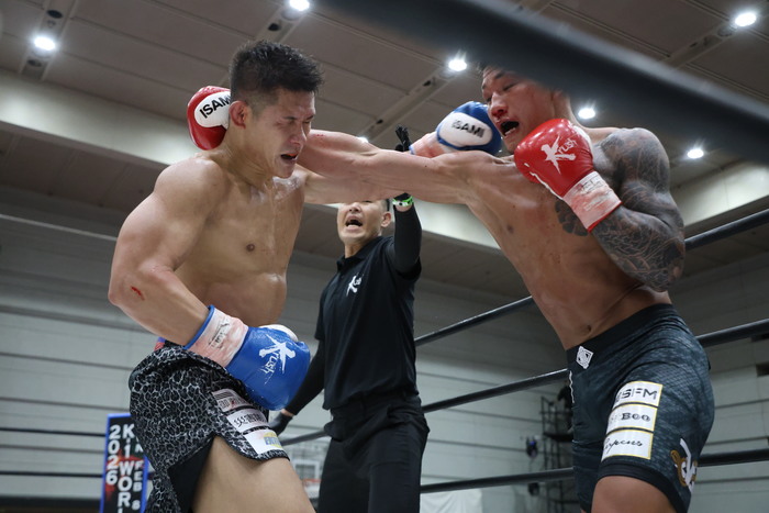 2R、前に出てワンツーを打つ杉若に、松本は左ストレートからの右フックを返す。顔面にパンチを当て、ボディと足へ攻撃を散らす松本が左ストレートもヒットさせる。それでも前に出る杉若は右ストレート、松本は左ヒザで迎え撃つ。細かいパンチから左奥足ロー、左ヒザ、与座キックと押し返す。右ストレートの杉若に松本は左奥足ローを狙い撃ち。