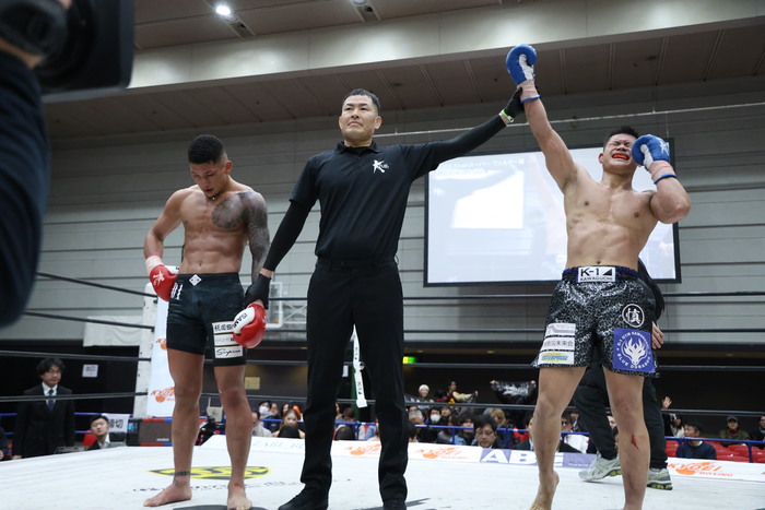 3R、杉若がワンツーを連打して前に出ていくが、松本も左ストレートで迎え撃ち、プッシュしての左奥足ロー。前に出る杉若をプッシュして下がらせる松本。杉若は至近距離で顔面へのヒザを狙う。松本が左ストレートをヒットさせるが、すぐに杉若が右ヒザを顔面に当てる。残り10秒、松本がラッシュをかけて印象付けた。