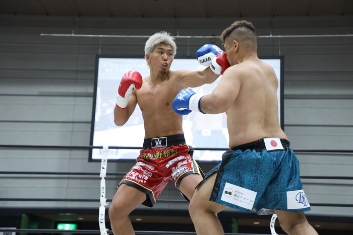 1R、上背で優る戦熊がじりじりと前へ出ていき、右ストレートと左右フックで肉弾子をよろめかせる。肉弾子も戦熊のパンチをもらいながらも左右フックを打ち返すが、戦熊の右で大きくのけ反る場面も。打ち返してくる肉弾子に、戦熊はならばとヒザをボディへ。ヒザからのワンツーで肉弾子をコーナーへ詰める戦熊。ほぼ一方的な展開に。