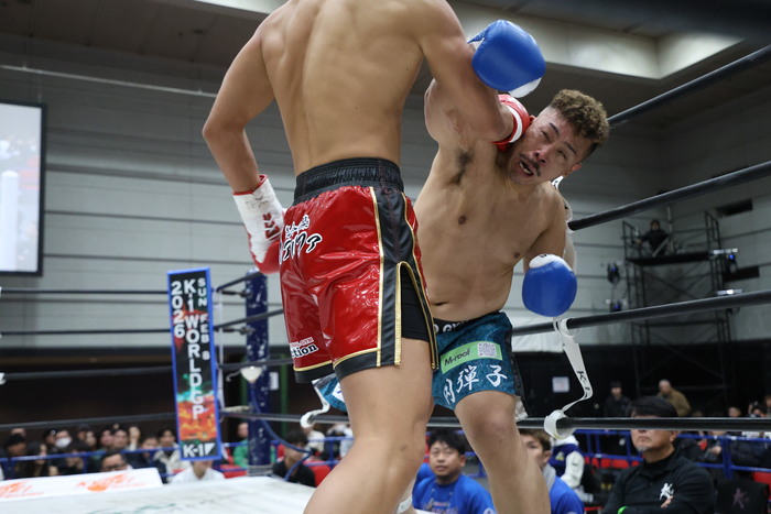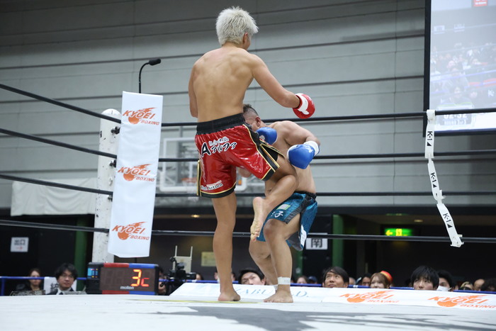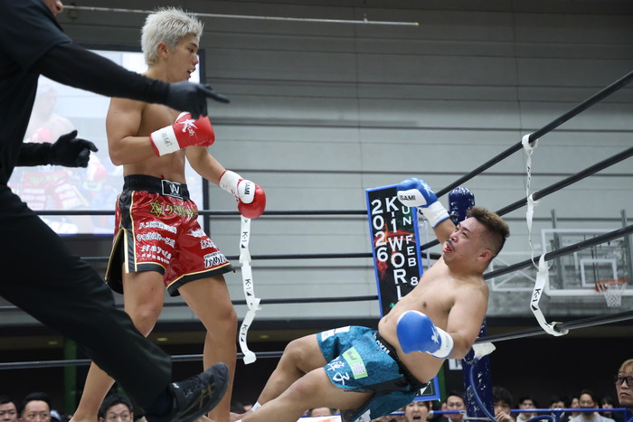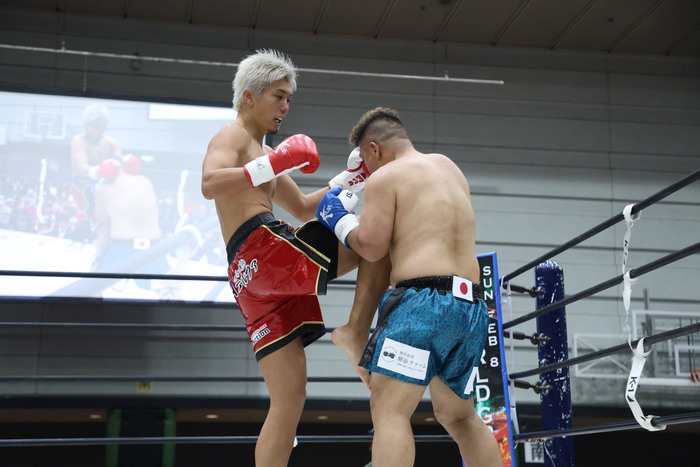 2Rも前に出る戦熊が前蹴り、左右ミドル、ワンツー。そのワンツーに左右フックを合わせに行く肉弾子。どっしり構えて左右フックを合わせるようになった肉弾子だが、戦熊のヒザ蹴りからのワンツーをもらう。終盤、戦熊がワンツーで肉弾子をコーナーに詰めてラッシュを仕掛けた。