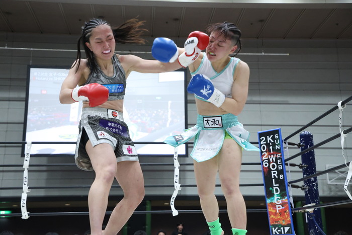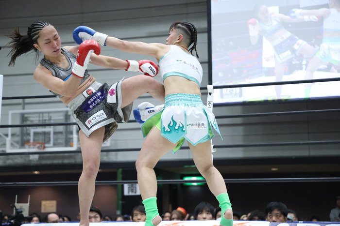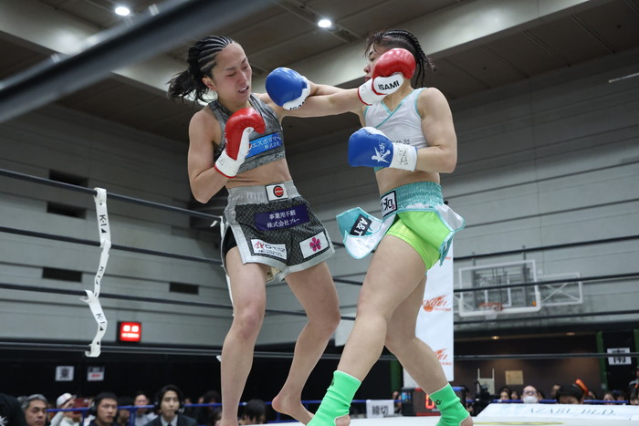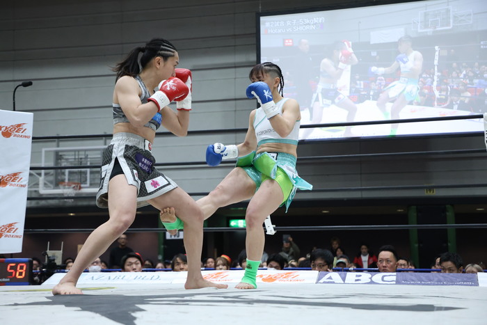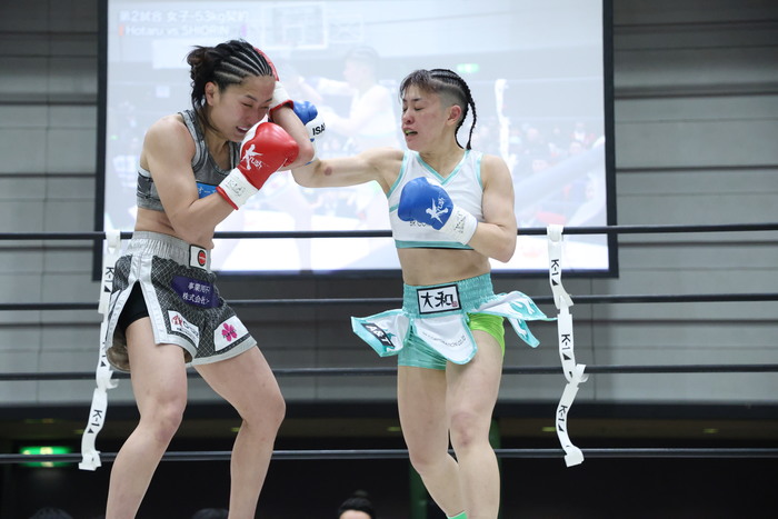 SHIORINは小さい前後へのステップを踏み、飛び込んでのワンツー。Hotaruが前に出てくるとバックステップしての右ストレートも繰り出す。SHIORINの右ローにはHotaruがバックハンドブロー。Hotaruは左ミドルで距離を作り始めるが、SHIORINは蹴り足をつかんでしまい警告を受ける。