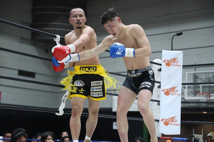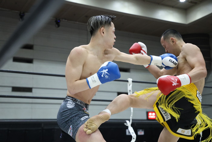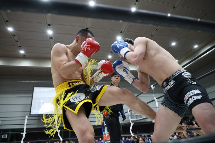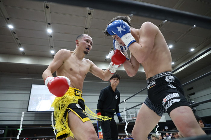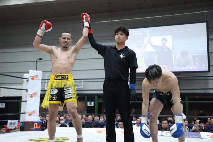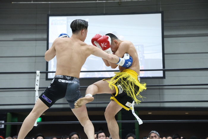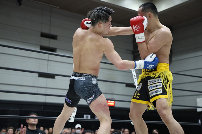 1R開始と同時に前へ出ていき左カーフを蹴る新美に、松本はワンツー、右ボディ。しつこく左ローと右インカーフを蹴る新美に松本も右ボディを狙い撃ち、右ボディからの右アッパーも打つ。距離を詰めてくる新美をかわしながら右ボディ、ワンツーを打つ松本。新美は左ロー、右インカーフ。松本は飛び込んでの右アッパーをヒット。