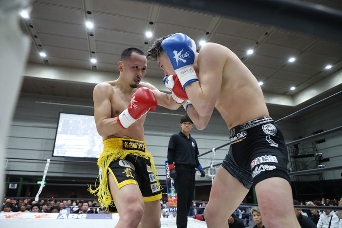 2R、新美は左ローを蹴っていき、松本はジャブとワンツーで迎え撃つ。ジャブ、右ボディ、そこからの右ストレートとパンチを的確に当てていく松本。新美はしつこく右インカーフと左ローを蹴り、松本の右ボディや右フックをもらっても前へ出続ける。新美は右奥足ローも蹴り、松本のパンチを浴びながらローを蹴って前へ出る。