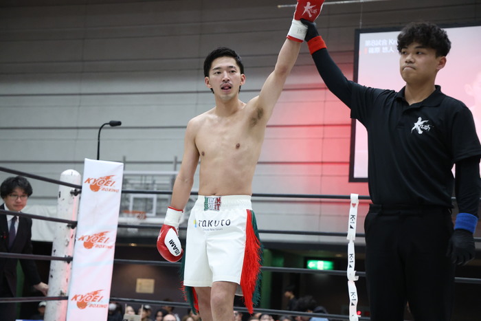 篠原はマイクを持つと「今回の試合は勝つのは大前提で、どう勝つかが問われる試合だったと思うので、KOで勝ててよかったです。新太選手も気合い入ってて前に出てくれたのでこういう面白い試合になったと思います」と話した。