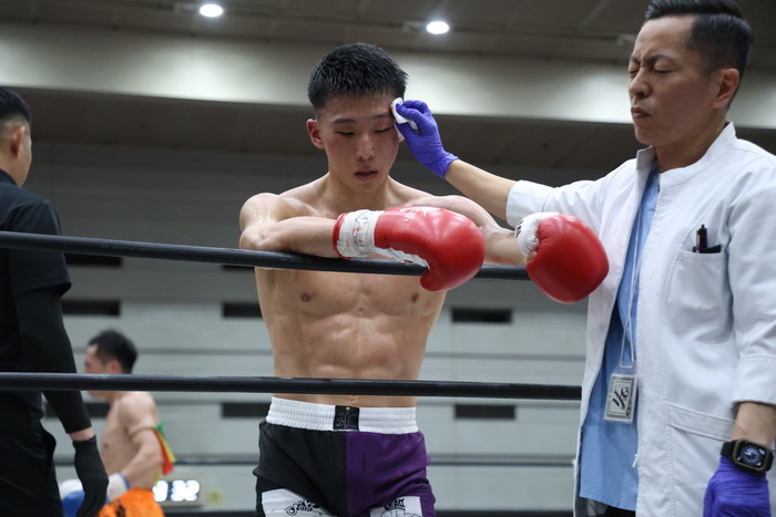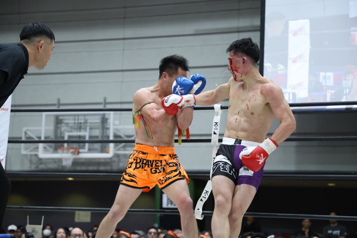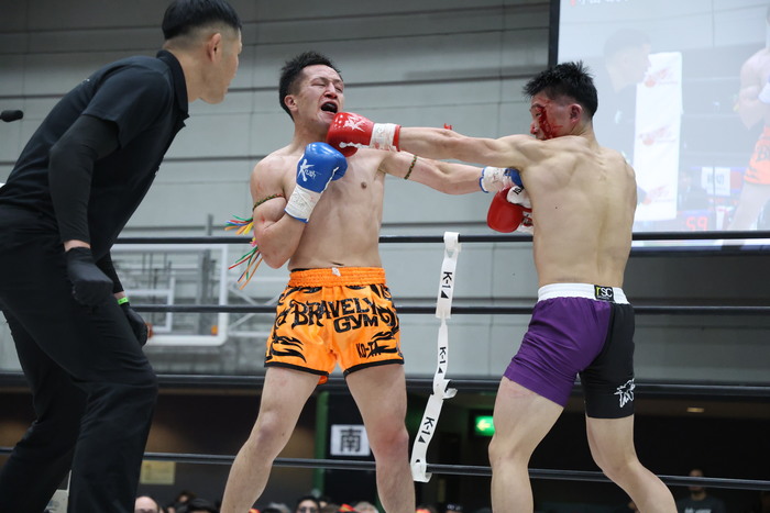 3R、小田が左インローからワンツー、ヒザ。両者接近戦で小田が左フック。KO-TAはプッシュして左右フックと右ヒザ。小田も負けじと左ストレート。ワンツー・左ボディ、左ミドルで前に出る小田が左ストレートもクリーンヒットさせる。攻勢だった小田だが左目上をカットして大流血に。ドクターチェックとなった。