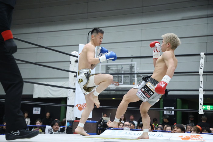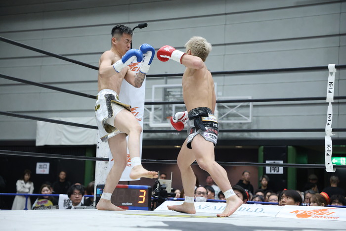 1R、両者サウスポー。右三日月と左カーフを蹴る石郷。2発目の左カーフで大輝の足が大きく流れる。石郷は左の三日月蹴りのように、中足でふくらはぎの横の部分を蹴り、これで大輝が大きなリアクション。石郷がパンチで詰めようとしたが、大輝がダウンし、そのまま立ち上がることが出来ず担架で運ばれた。
