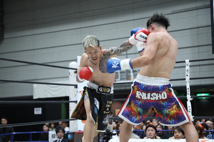 1R、ゴングと同時に飛びヒザ蹴りの奇襲をかける佑典。龍翔は広いスタンスで構えて圧をかけていくが、佑典の左ストレートがクリーンヒット。その後も思い切り左ストレート、右フックを放つ佑典。龍翔は追い詰めても先手を取られる。強引に距離を詰めてボディからの連打を放った龍翔だが、バッティングとなって試合は中断。龍翔も右目上をカット。再開後も前に出ていく龍翔だが、よく動く佑典を捉えられない。