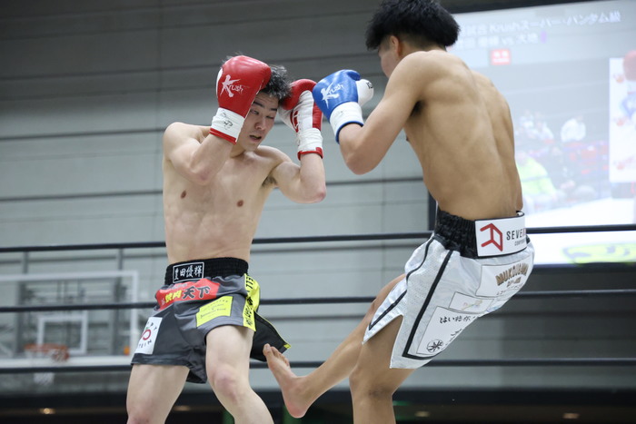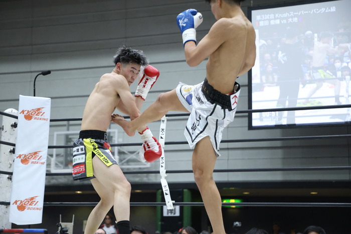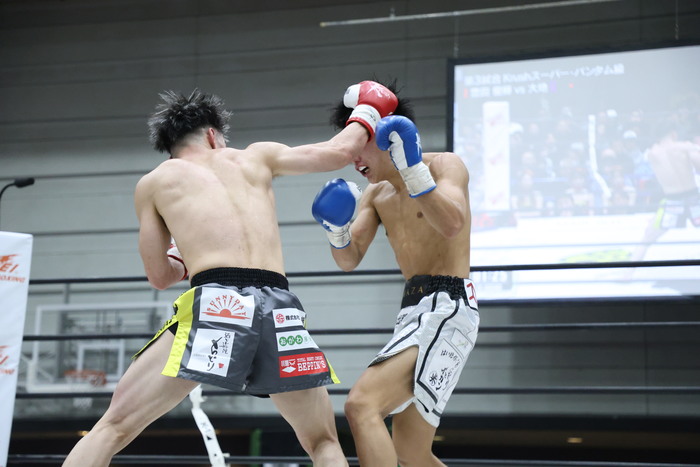大地がワンツー、ワンツーからの右ミドル。豊田は横へ動いて左ストレート。豊田は左ストレートを当ててサイドへ回り込み、右アッパーも繰り出す。大地は右ローを蹴っていき、豊田がパンチで迎え撃つ。右インローを蹴り、左右フックの大地。