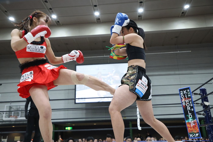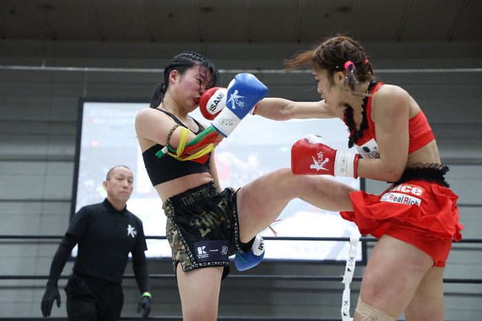 1R、右ローと右カーフの蹴り合い。麻央は左右の蹴りを上下に散らすコンビネーション。KOKOROもワンツーから右ロー、麻央は左ボディから右ロー。ワンツー・右ロー、ワンツー・ヒザ蹴りと蹴りを混ぜたコンビネーションを次々と出す麻央に、KOKOROはガードを固めて前に出ていき右ストレートから左ミドルを蹴る。負けじと右ミドルを蹴っていくKOKORO。