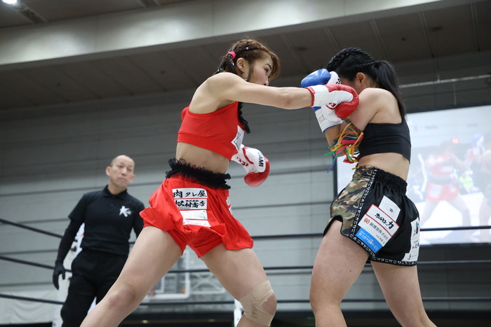 終盤、KOKOROが右ミドルハイと左右の連打で前へ出たが、麻央も左右連打を打ち返して試合終了。判定3-0で麻央が勝利した。