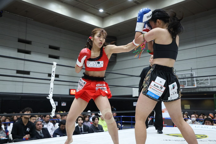 2R、ムエタイスタイルでアップライトのKOKOROはじりじりと前に出ていき、麻央のコンビネーションを受けると右ローと右ミドルを蹴り返す。麻央は前蹴りでKOKOROを転倒させ、パンチから蹴りのコンビネーションを回転させる。ワンツーから左右ミドル、そしてローを蹴る麻央。右ストレート、左フック、右ローの麻央は左ヒザ、左ミドルと畳みかけた。