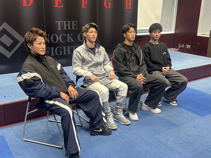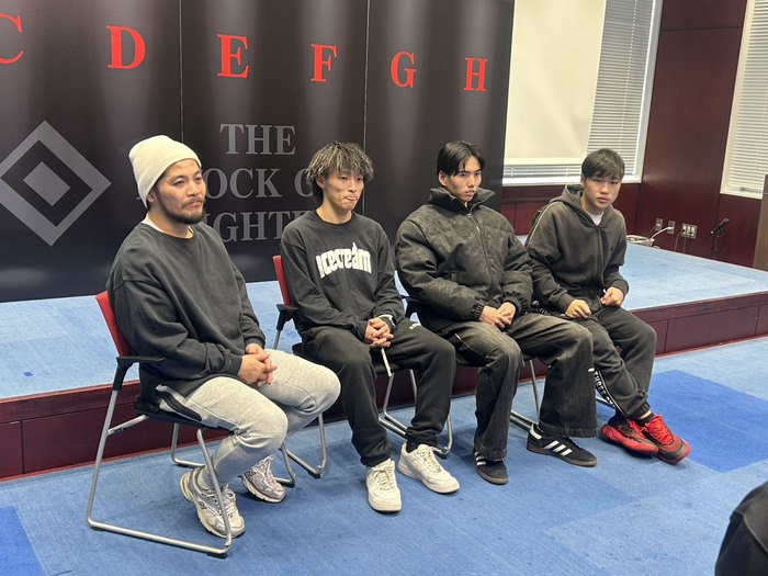 大沢ケンジ「(このルールのキツさを一番分かってると思うが、どう戦う?)キツいっすよね。でも若いんで、小細工すんな、最初から行けと。早めに終わらせて、なるべく体力を使わないように勝とうと。(3人で一番なのは?)分かんないですけど、みんな若いし、これからだなと思ってるんで、みんな同じぐらいですよね。相手が金ちゃんのジム、MMAのジムなんでね、組みをしっかりやってそうだなというところがあるんですけど、MMAのジム相手だったら、ウチは打撃はけっこう自信あるんで、(問題は)組みですよね。(組む前に終わらせる?)それも混ぜられればいいなと思うんですけど、打撃は自信あるんで、やってくれると思います」