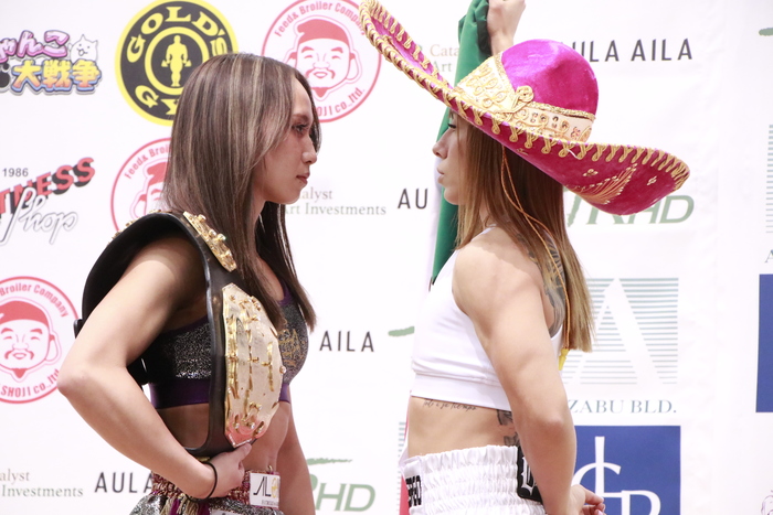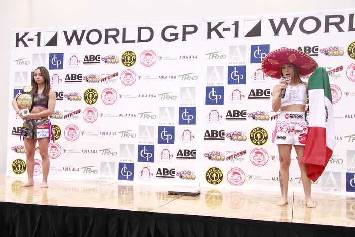 第6試合のK-1 WORLD GP女子アトム級(-45.0kg)タイトルマッチ3分3R延長1Rで対戦する、王者・松谷綺(ALONZA ABLAZE)は44.7kg、挑戦者ベロニカ・ロドリゲス(メキシコ)はリミットちょうどの45.0kgでそれぞれ計量をパス。