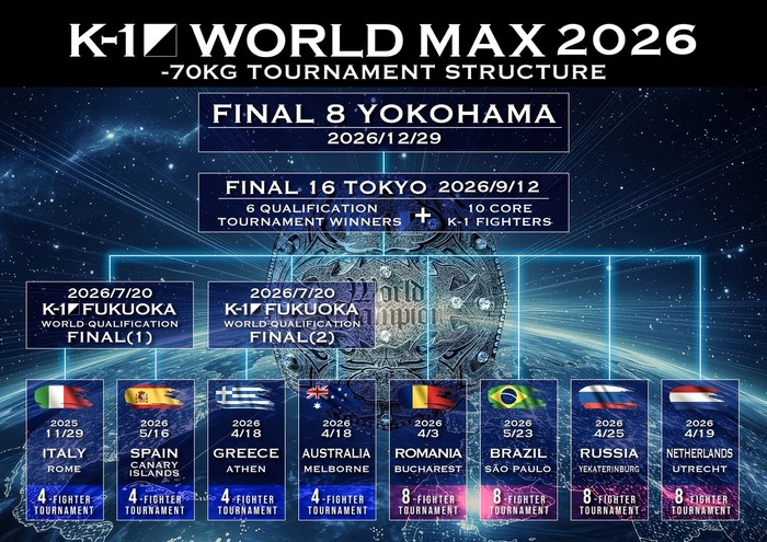 ルーマニア、ブラジル、ロシア、オランダは8名のワンデイトーナメントを行い、優勝した4名が9月12日(土)東京・国立代々木競場第二体育館『K-1 WORLD MAX 2026』のFINAL16へ進出。イタリア、スペイン、ギリシャ、オーストラリアは4名のワンデイトーナメントで、優勝者が7月20日(月・祝)マリンメッセ福岡B館『ECO信頼サービス株式会社PRESENTS K-1』へ駒を進め、イタリアvs.スペイン、ギリシャvs.オーストラリアの勝者がFINAL16の出場権を争う。