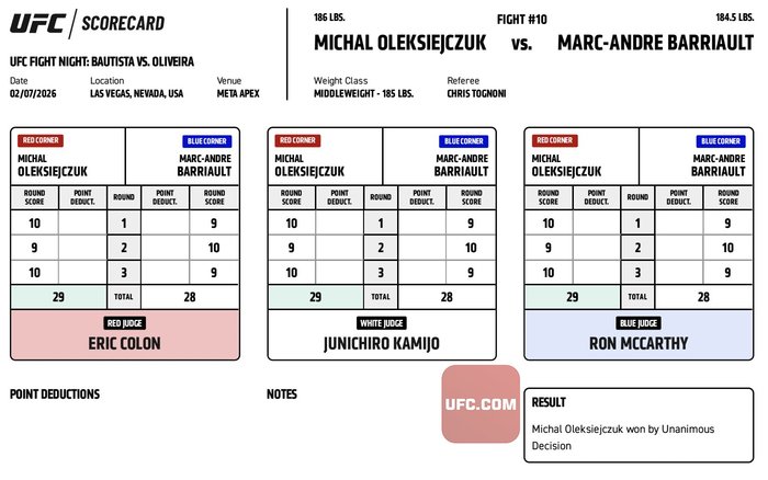 左前蹴りのオレクシェイチュク。ベリオーは左ジャブ。右ハイも、オレクシェイチュクも左ハイを返して前に。最後はオレクシェイチュクが左オーバーハンドをガード上に叩いてホーン。オレクシェイチュクのラウンドに。判定3-0(29-28×3)でオレクシェイチュクが勝利。UFC3連勝に。