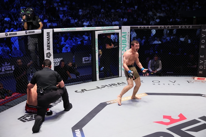 さらに右オーバーハンドからダブルレッグテイクダウン! 尻を着いたピネドを引き出すと、マットに背中を着いたピネドのペダラーダの足をさばき、サイドに出てクルスフィックスからヒジ連打! レフェリーが間に入った。カザフスタンの国旗を掲げたイスブラエフは、MMA10勝無敗に。