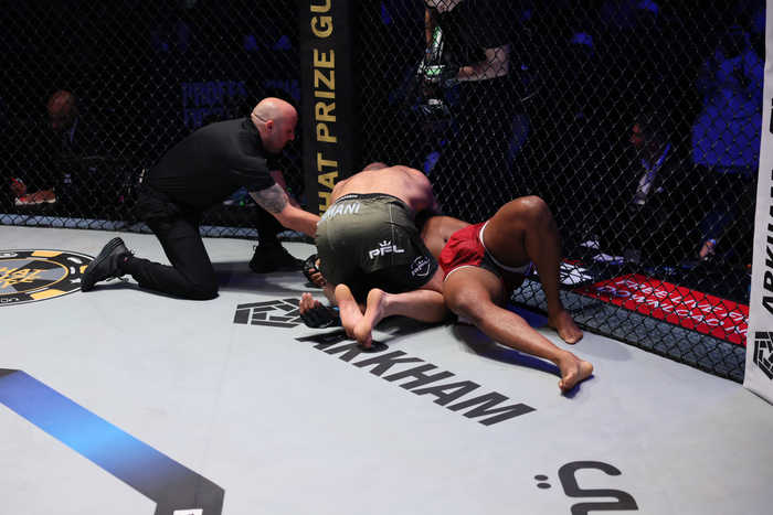 ラウマニが2R、ダブルレッグテイクダウンからクルスフィックス、肩固めでタップ奪う。