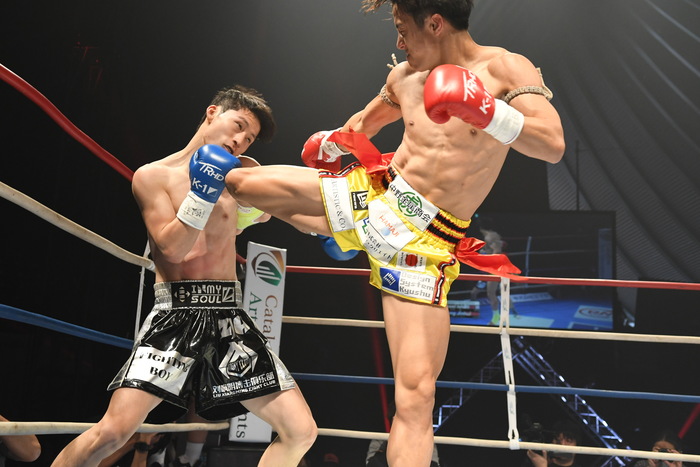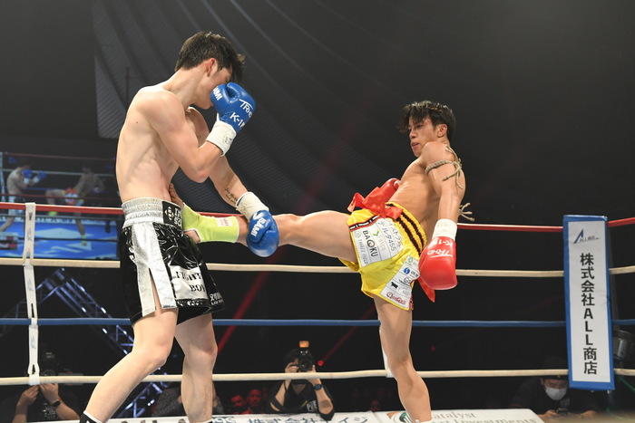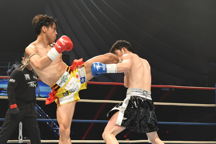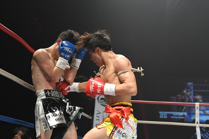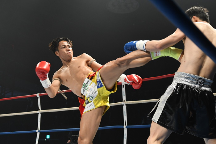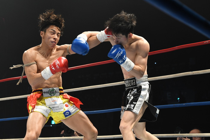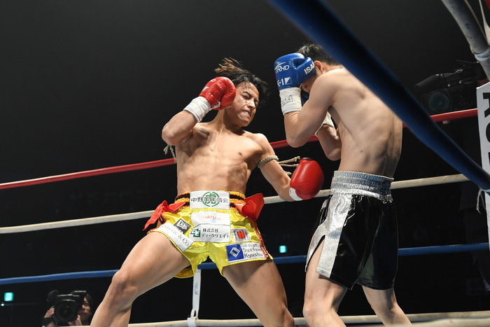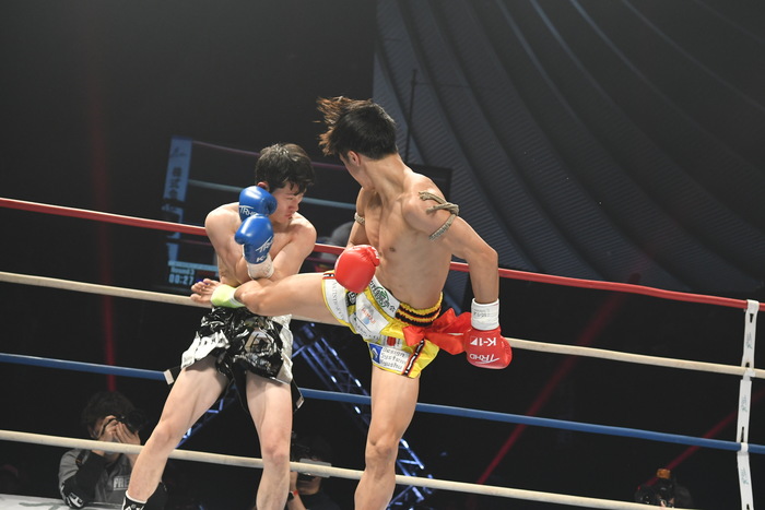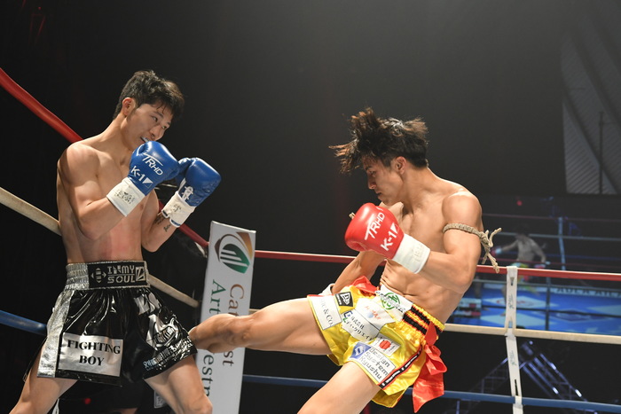 ジンホイのパンチをステップとボディワークでかわす石井は右ボディストレート、左ボディ、右アッパー。さらに左ローを蹴る石井が攻勢に。左ボディ、右アッパー、右ボディストレートとジンホイにロープを背負わせる石井。ジンホイの手数が極端に減り、下がる。そこへ石井が後ろ蹴り。左フックから右ボディ、さらに左ボディを狙い撃ちにし、ヒザ蹴り。