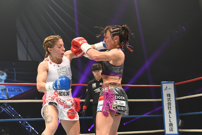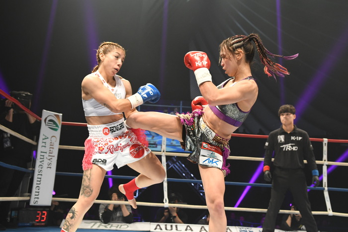 ロドリゲスがサウスポーにスイッチして右フックから左ストレート、オーソドックスに戻ると松谷が右カーフを蹴る。松谷の右ミドルには右ストレートを合わせに来るロドリゲスだが、松谷はすぐに右ミドルを蹴り返す。前蹴り、右ミドル、右カーフと蹴りを当てていく松谷。前蹴りでロドリゲスを下がらせる。