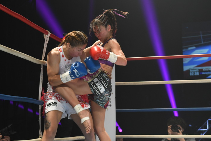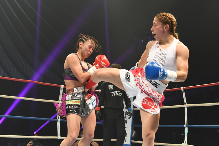 2R、前に出る松谷は前蹴りでロドリゲスを下がらせ、コーナーに詰めると左右ボディにヒザ蹴り。ロドリゲスが前に来ると右カーフ、左三日月蹴り。ロドリゲスは左フックを強振してくるが、松谷はかわして前蹴り。負けじとロドリゲスも左ボディを連打する。松谷は前蹴りからヒザ、すぐに左三日月。