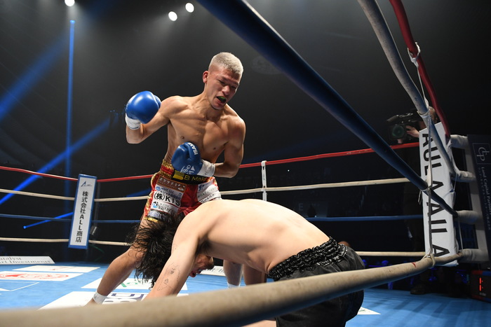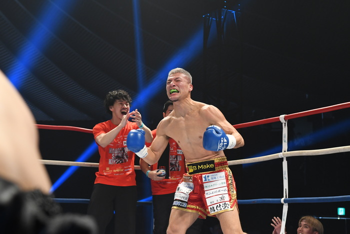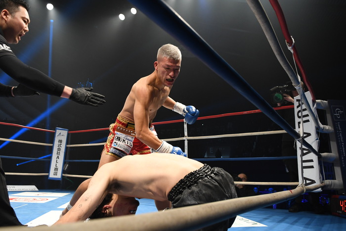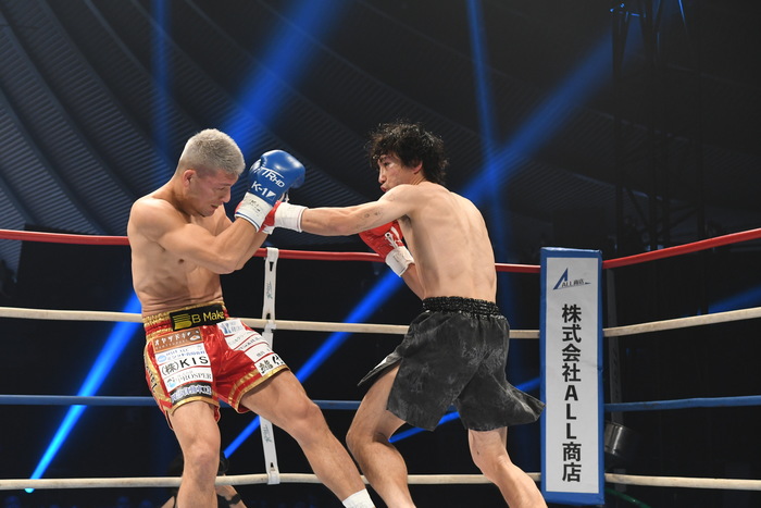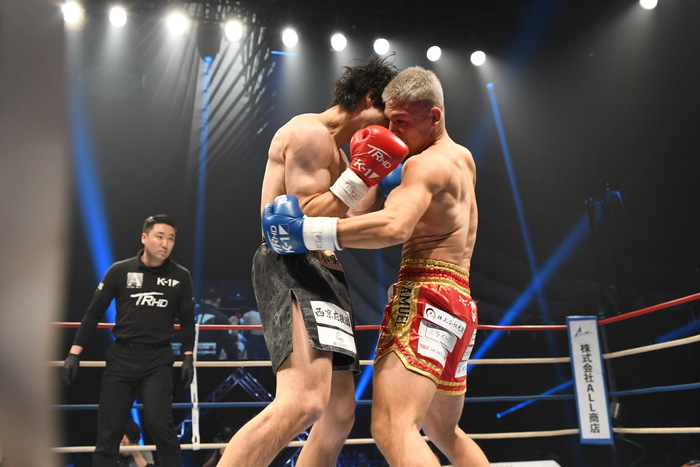 1R、永澤が前に出て左ローと左ボディ、西京はヒザ蹴りから左右フック。前に出て左ローをしつこく蹴る永澤を西京は左右フックと右アッパーで迎え撃つが、永澤が超近距離戦で左ローから左右フック、そして左ボディ。これでダウンを奪う。